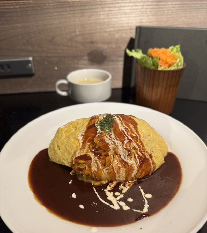 オムライスのデミグラスソース掛けをスープとサラダ、ドリンクのセットでいただきました。