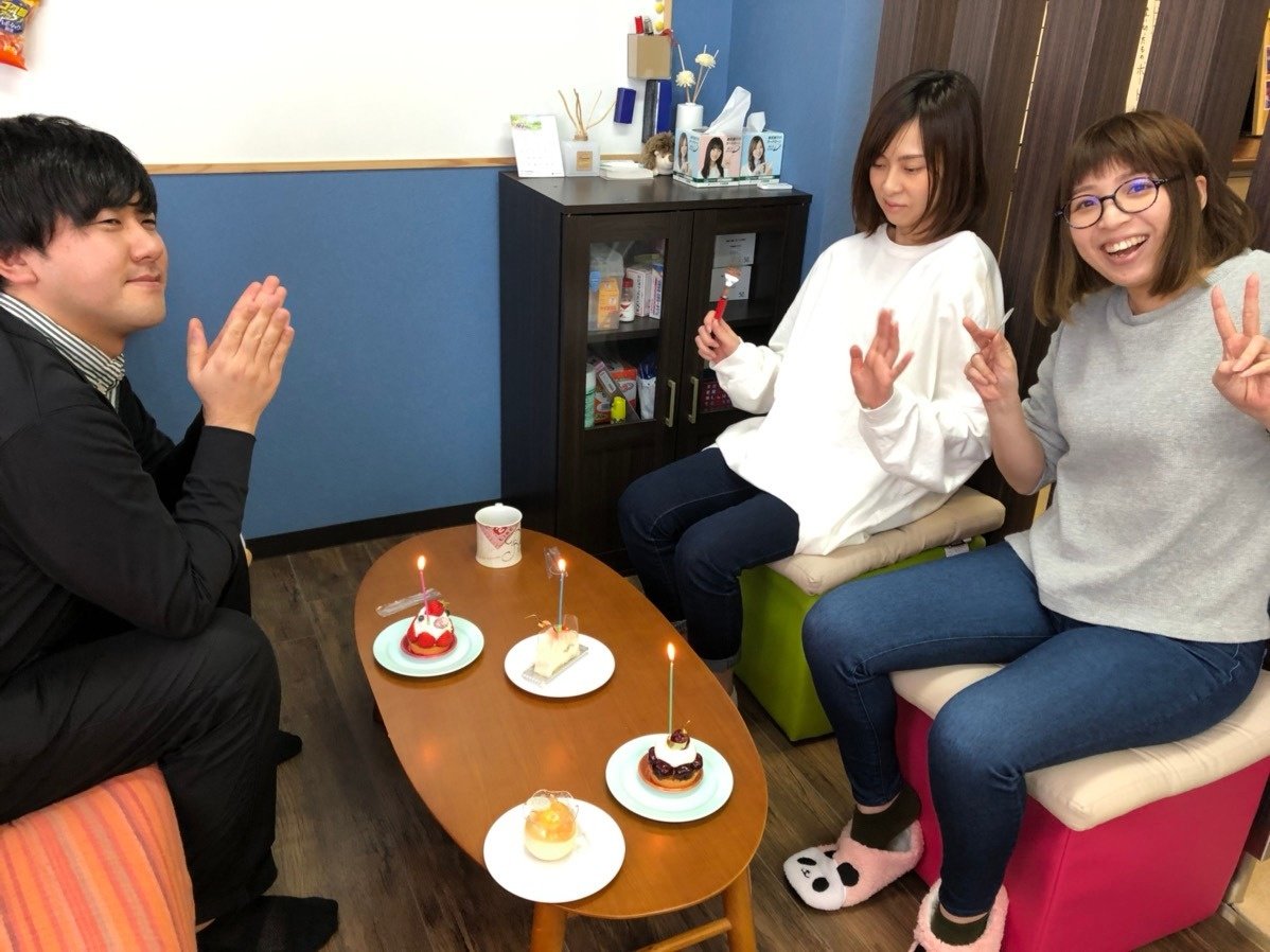 こんにちは!にいがた三昧レク委員会です! 先日、にいがた三昧恒例のお誕生日会を開催しました! (にいがた三昧では、スタッフの生まれ月に誕生日会を開催しております!) 今回は5月・6月生まれのスタッフをまとめてお祝いしました! バースデーケーキのろうそくの炎がきれいですね。 もちろん全員でバースデーソングも歌いました! 今年一年もみんな元気に頑張っていきます(^_^)/