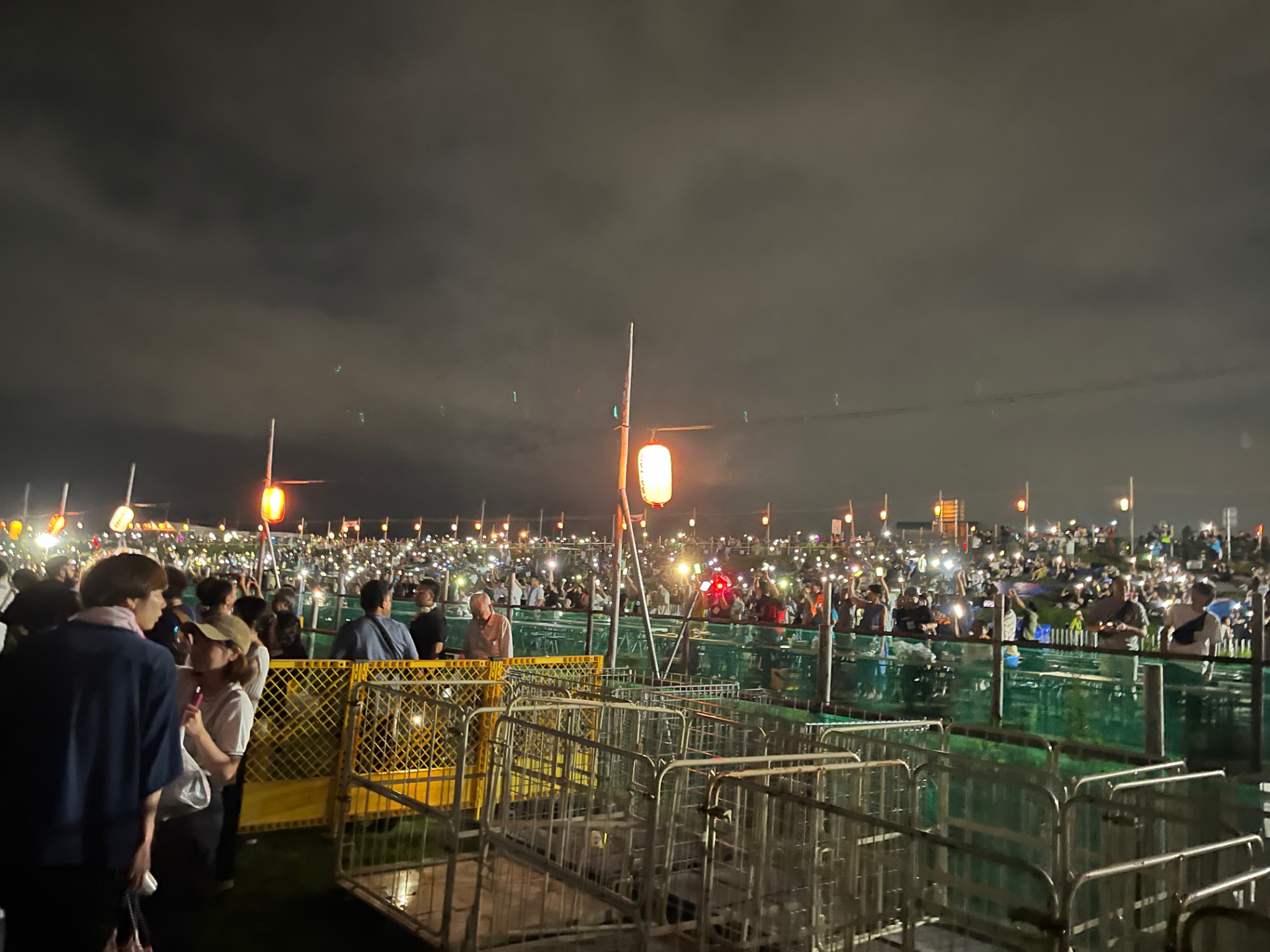 観覧席が長岡駅を背にして川の向こうの席でしたので、バスに乗って行こうと思ったらすごい人が並んでいて、途中まで並んでいましたが、案内係の方から2時間後となると聞いて諦めました。