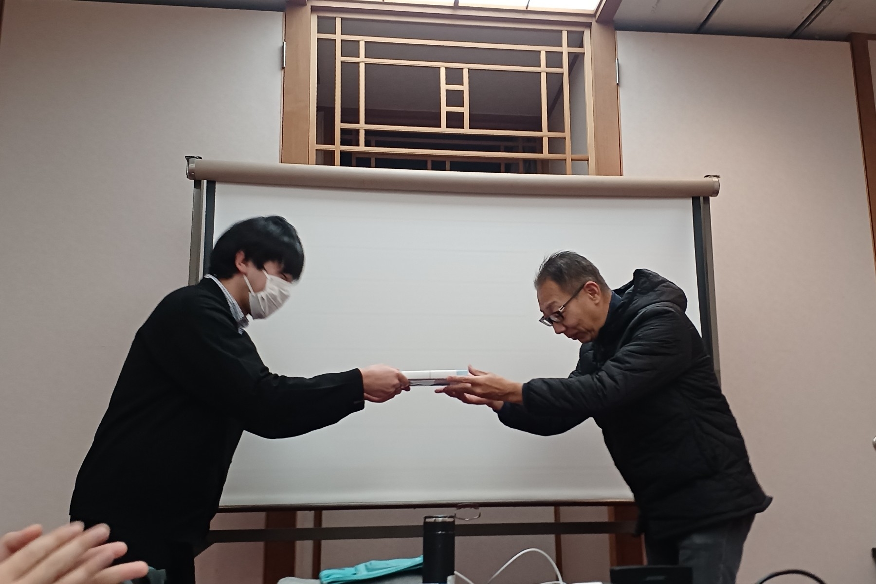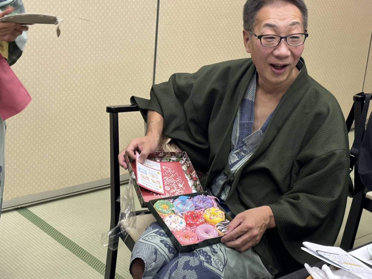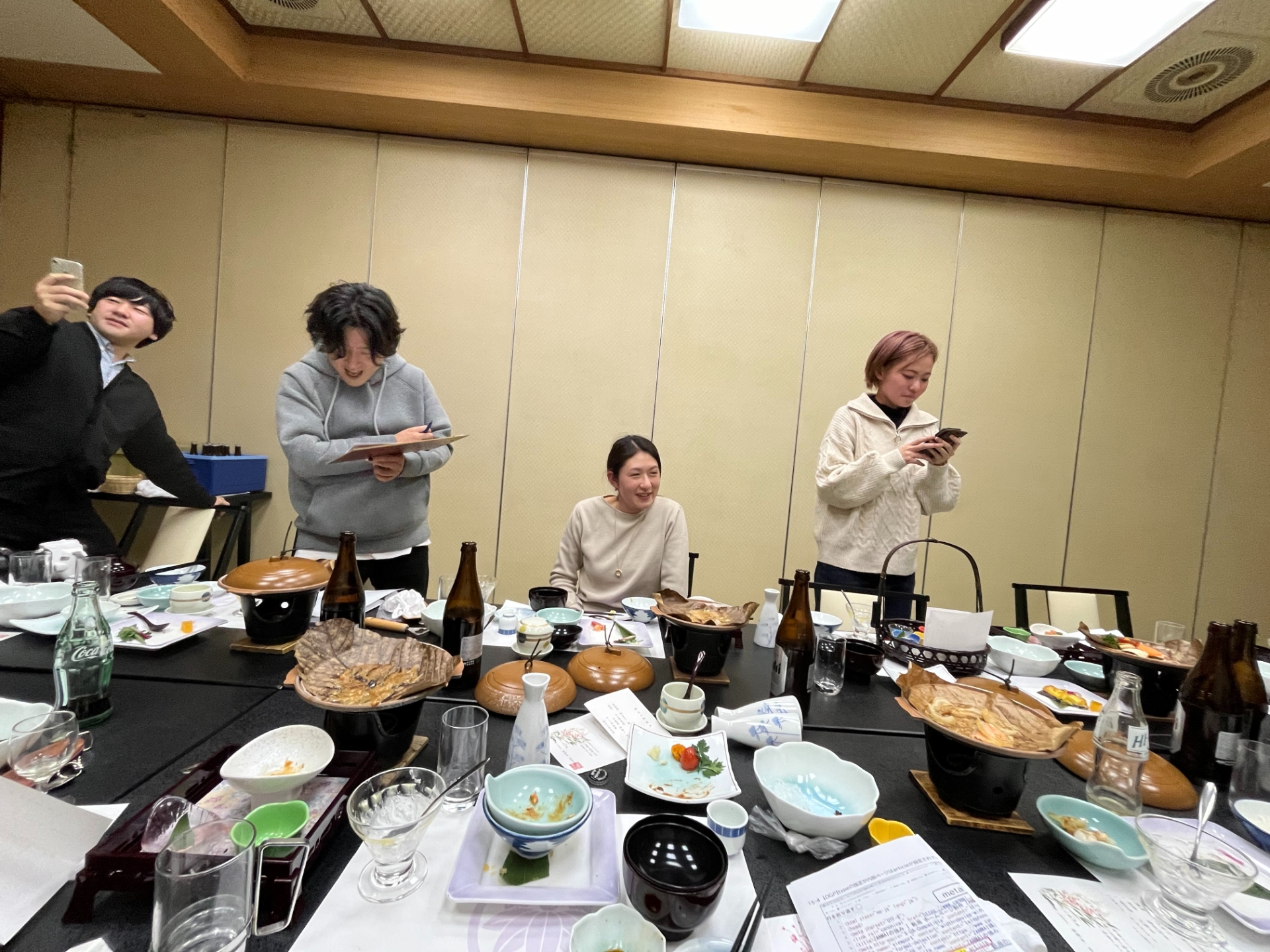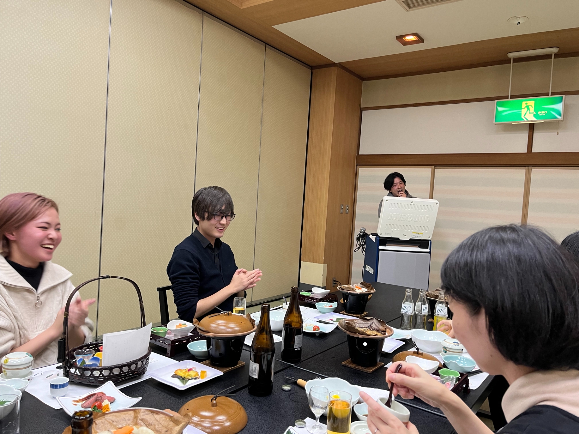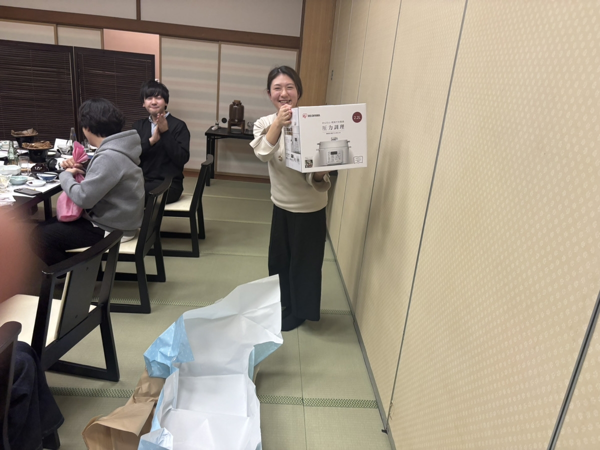 夜の宴会では、おいしいご飯をいただきながらカラオケやゲーム大会、プレゼント交換で盛り上がりました!