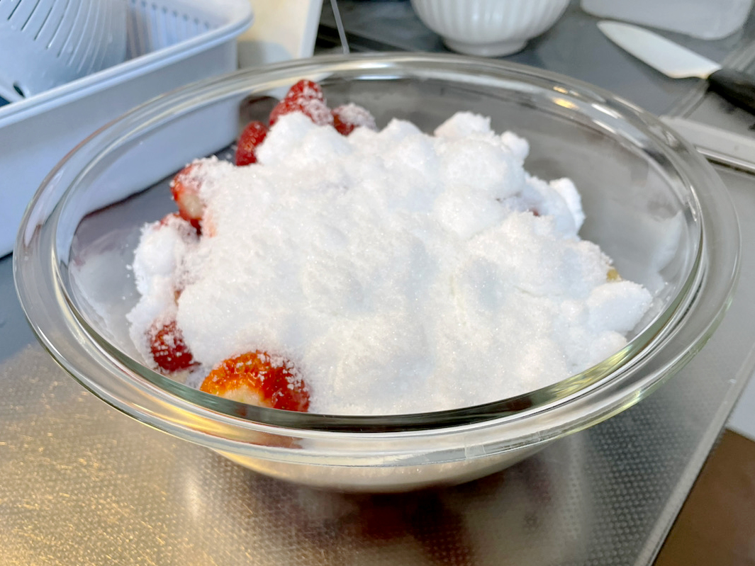 イチゴの実をしっかりと洗ったら、水気をきり、砂糖をまぶして一晩おいておきます。