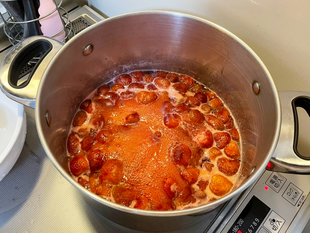 一晩おいたら、イチゴから赤い果汁が染み出してくるので、実と果汁をごっそり鍋に入れて煮ていきます。